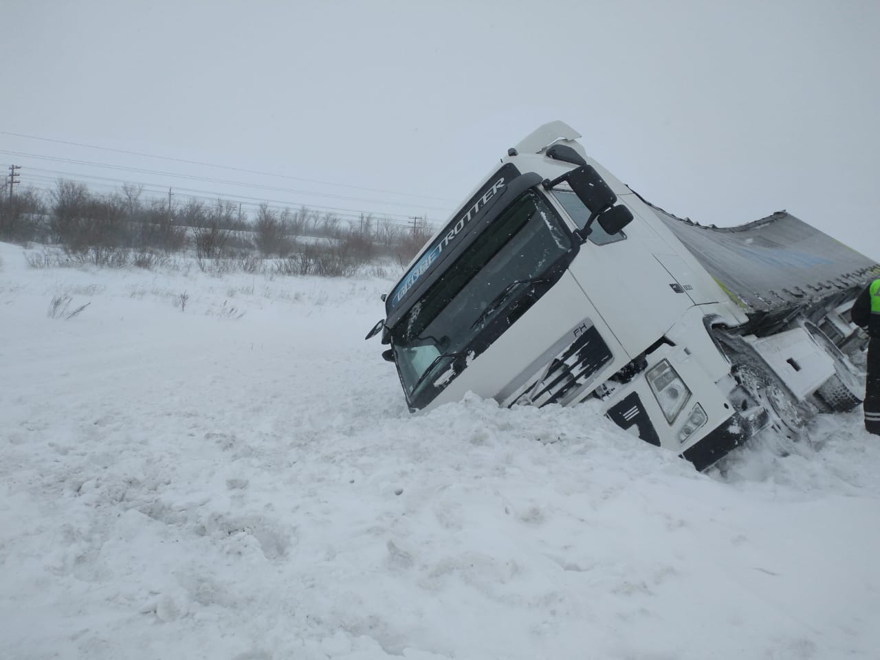 Мужчина собрался сделать остановку на обочине для отдыха, но из-за сильного бокового ветра тяжелая машина съехала в кювет и опрокинулась на правый бок.