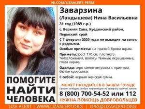 Нина Заварзина, 31-летняя жительница села Верхняя Сава Куединского района Пермского края с 7 февраля не выходит на связь с родными. Приметы: полного телосложения, глаза карие, волосы каштановые, окрашенные. Особые приметы: шрам на правой брови. Была одета: серо-синяя ветровка с принтом, белые кроссовки. С собой: черная женская сумка. Всех, кому что-либо известно о местонахождении пропавшей, просят позвонить по телефону:...