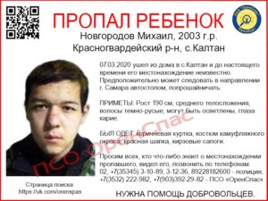 В Оренбургской области сотрудники полиции и волонтёры ПСО «ОренСпас» разыскивают Михаила Новгородова 2003 года рождения. 7 марта 2020 года подросток ушёл из дома в селе Калтан Красногвардейского района и до настоящего времени его местонахождение неизвестно. По оперативным данным, юноша может двигаться автостопом в направлении Самары. Он также может попрошайничать. Приметы: рост 190 см, среднего телосложения,...