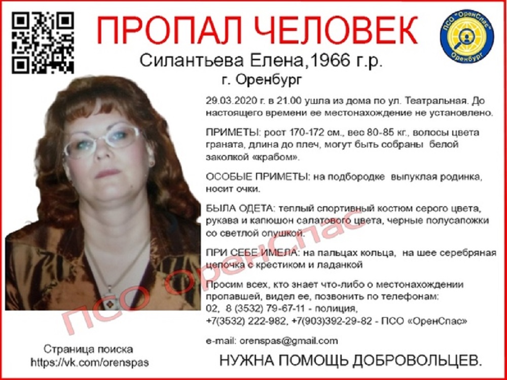 29 марта около девяти часов вечера Елена Силантьева вышла из дома по ул. Театральная и исчезла, сообщили в ПСО «Оренспас».