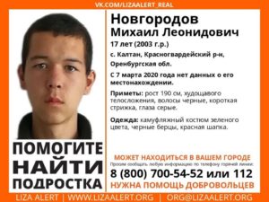 Следственными органами Оренбургской области возбуждено уголовное дело по факту безвестного исчезновения несовершеннолетнего Михаила Леонидовича Новгородова , 27 февраля 2003 года рождения. 7 марта этого года Михаил Новгородов выехал из посёлка Токское Красногвардейского района в Бузулук, где находился до 11 марта. 11 марта около 9 часов Михаил Новгородов ушёл из квартиры, расположенной по адресу: Бузулук,...