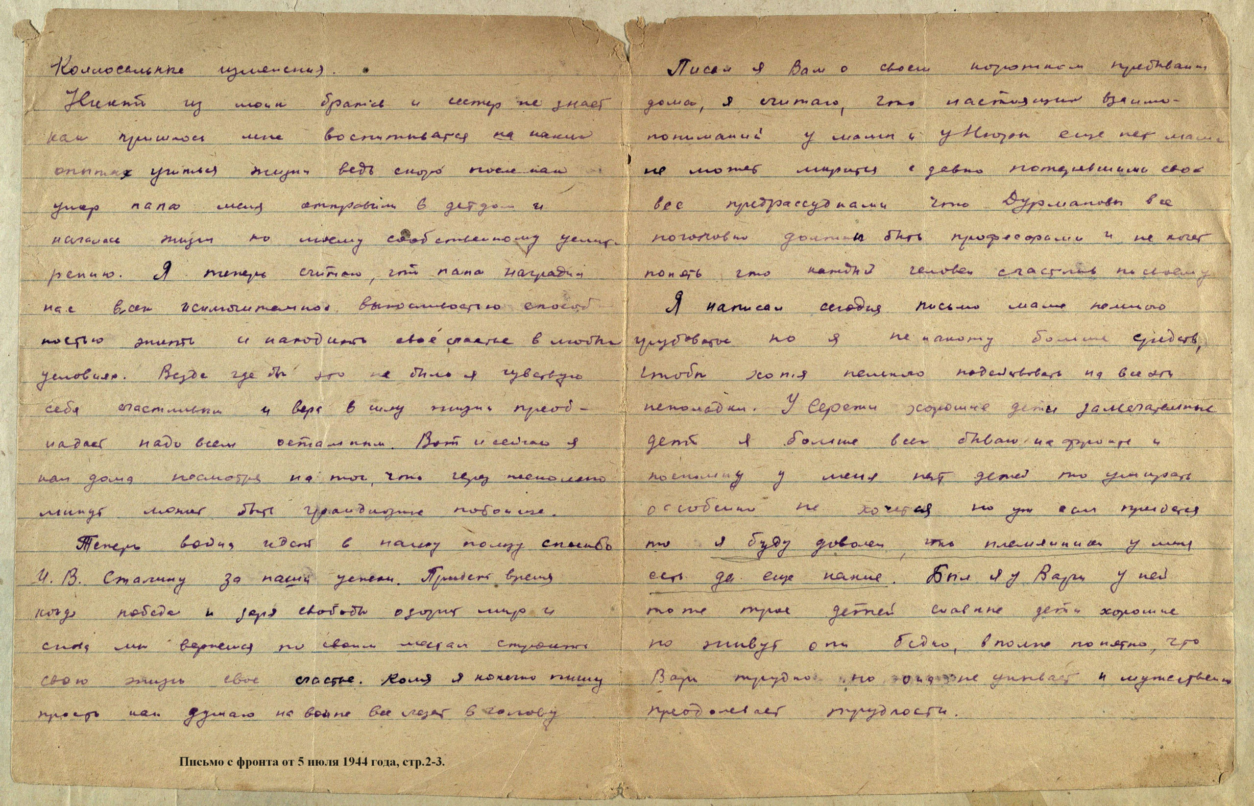 В письмах с фронта прослеживается живая история повседневности военного времени, они играют важную роль для изучения жизни советского солдата, его морального и психологического состояния. И хотя написаны они были с оглядкой на цензуру, всё же являются ценным историческим источником, достойным прочтения и изучения.
