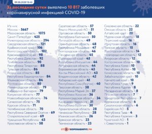 За последние сутки в России выявлено 10 817 заболевших коронавирусной инфекцией COVID-19 в 84 регионах, в том числе в Оренбургской области – 48. Активно выявлено 4399 (40,7%) случаев без клинических проявлений. В целом, в России зарегистрировано 198 676 случаев (+5,8%) коронавирусной инфекции в 85 регионах, а число выписанных по выздоровлению выросло до 31 916....