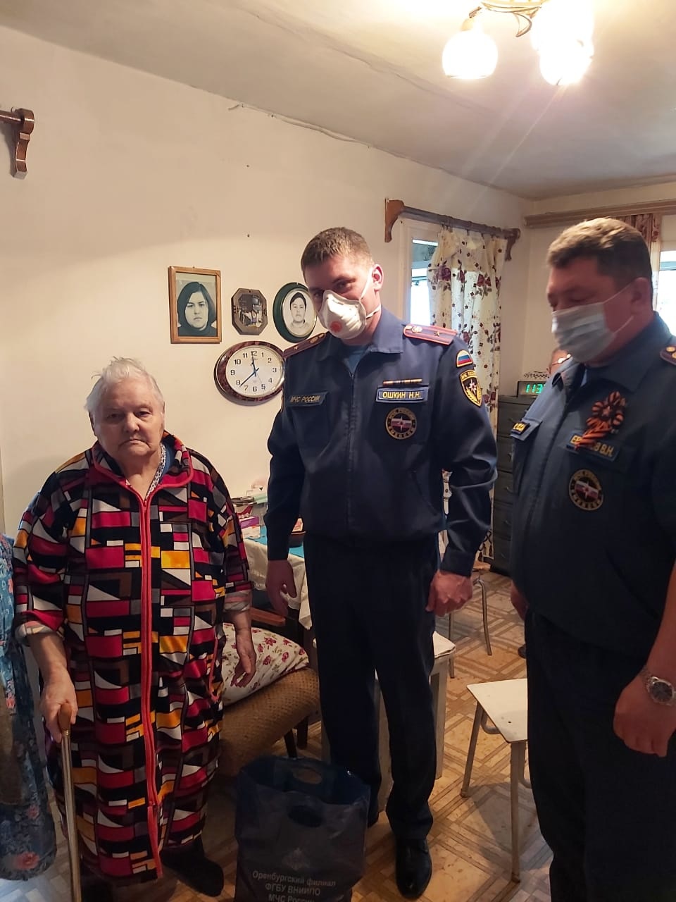 Начальник 10 пожарно-спасательного отряда ФПС ГПС Главного управления МЧС России по Оренбургской области Николай Ошкин и начальник ОНДиПР по городу Бузулуку, Бузулукскому и Грачевскому районам Владимир Евсюков посетили труженицу тыла Александру Степановну Гришину.