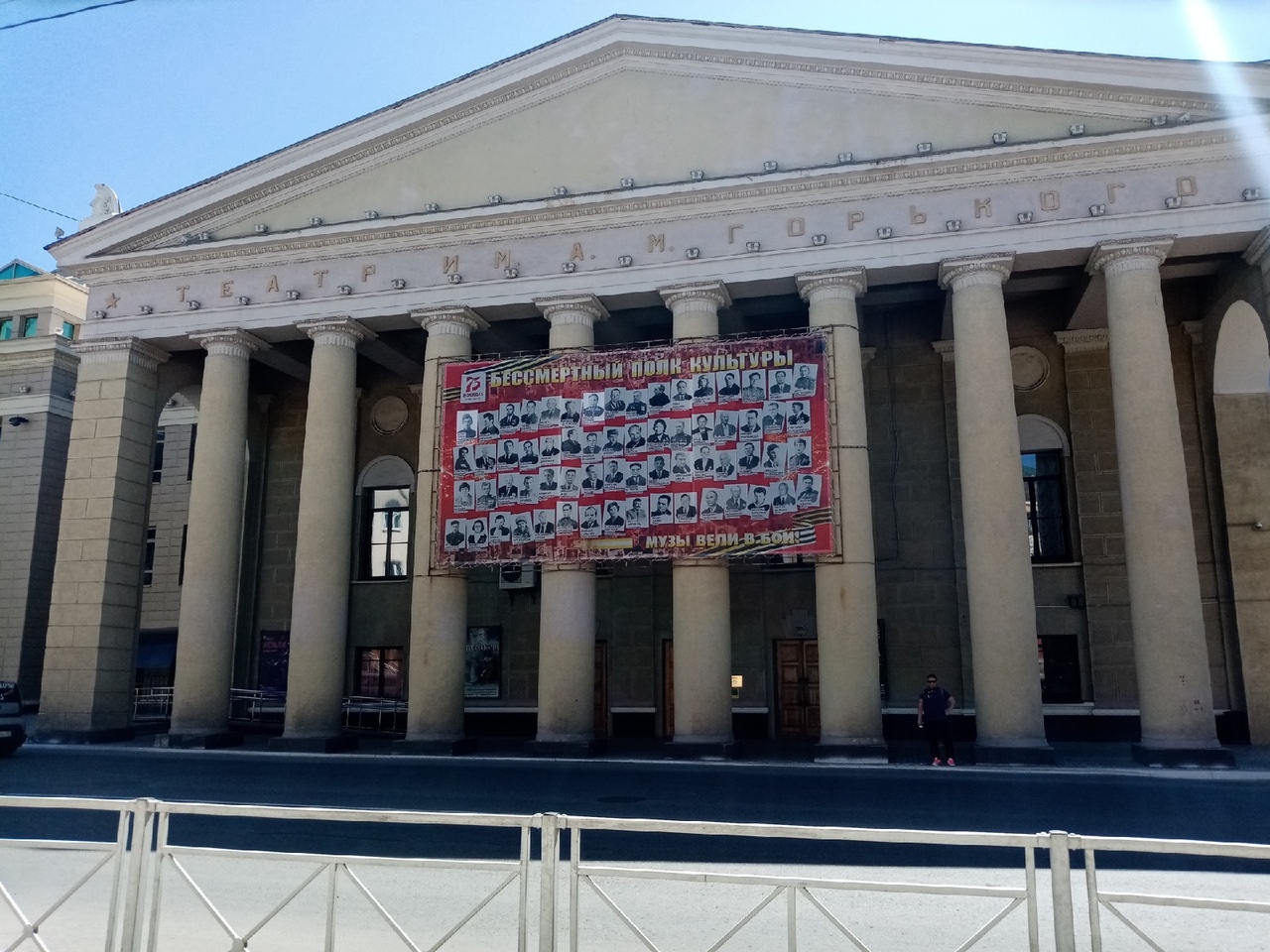 На здании областного драматического театра имени Горького вывесили красочный баннер.