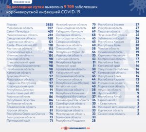 За последние сутки в России выявлено заболевших коронавирусной инфекцией COVID-19 – 9 709 в 85 регионах, в том числе в Оренбургской области – 35. 4 116 случаев (42,4%) выявлено активно у контактных лиц без клинических проявлений болезни В Российской Федерации нарастающим итогом зарегистрировано 281 752 случая (+3,6%) коронавирусной инфекции в 85 регионах, число выписанных...