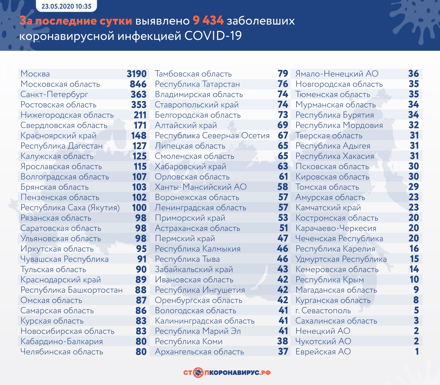 За последние сутки в России выявлено 9 434 заболевших новой коронавирусной инфекцией в 84 регионах, в том числе в Оренбургской области – 42.