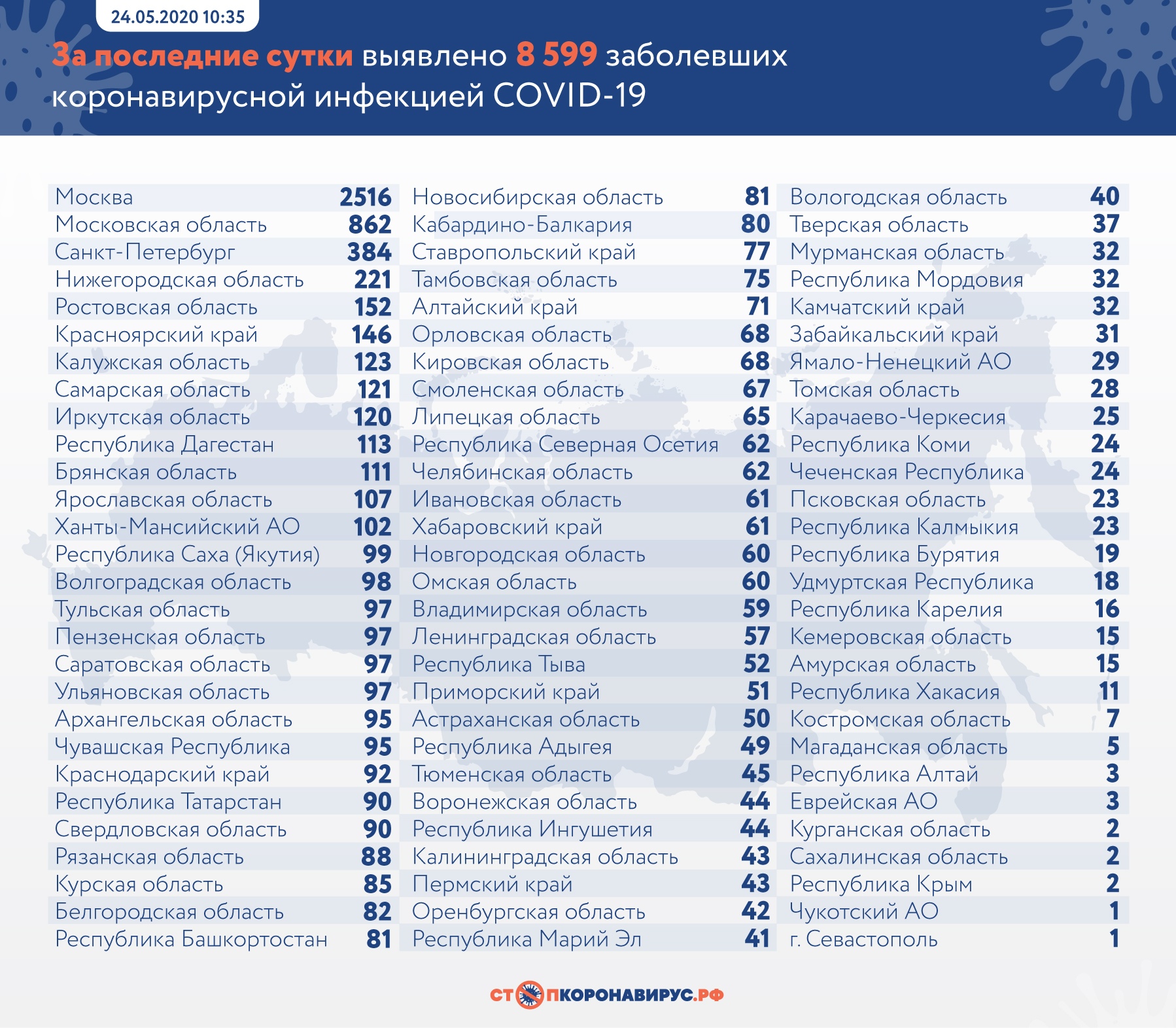 Под медицинским наблюдением в целом по России по состоянию на 24 мая остаются 282 тыс. человек.