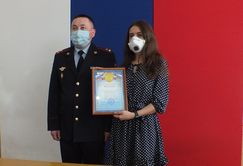 Заместитель начальника МУ МВД России «Орское» Руслан Умаргалеев вместе с представителем Общественного совета при МУ МВД России «Орское» Головиным Владимиром вручили благодарственное письмо Анастасии Гудковой, в котором выражается благодарность за грамотные и умелые действия, способствующие обеспечению правопорядка на территории Оренбургской области.