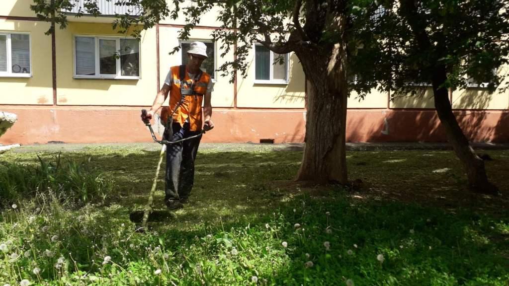 Муниципальные предприятия работают во всех микрорайонах города, в том числе и в выходные дни. Траву косят ручными бензокосилками, а также задействованы партерные и тракторные косилки.