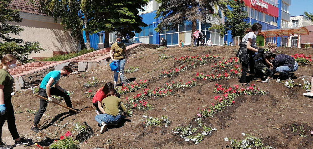 В течение двух дней волонтёры и их наставник Татьяна Однополова готовили место для посадки цветов: убирали мусор, траву, выполнили планировку. К будущим аграриям присоединились студенты медицинского колледжа и волонтеры поискового объединения «Бугуруслан». С их помощью на клумбу высажено 1600 петуний и бархатцев. На одной стороне клумбы цветочная композиция выполнена в виде пятиконечной звезды, на другой – «75 лет».