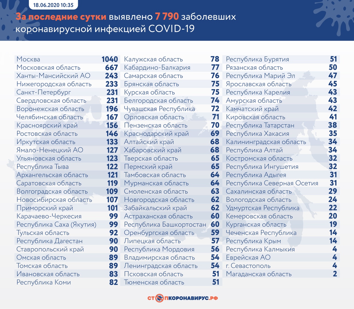 За последние сутки в России подтвержденных случаев новой коронавирусной инфекции COVID-19 – 7790 в 83 регионах, в том числе выявлено активно 2450 (31,5%) без клинических проявлений.