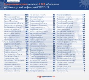 7728 случаев коронавирусной инфекции выявлено за последние сутки в 84 регионах России, в том числе в Оренбургской области – 56. 2335 случаев (30,2%) выявлено активно как контактные без клинических проявлений болезни. Всего Российской Федерации нарастающим итогом зарегистрировано 584 680 случаев (+1,3%) коронавирусной инфекции в 85 регионах, а число выписанных пациентов возросло до 339 711....