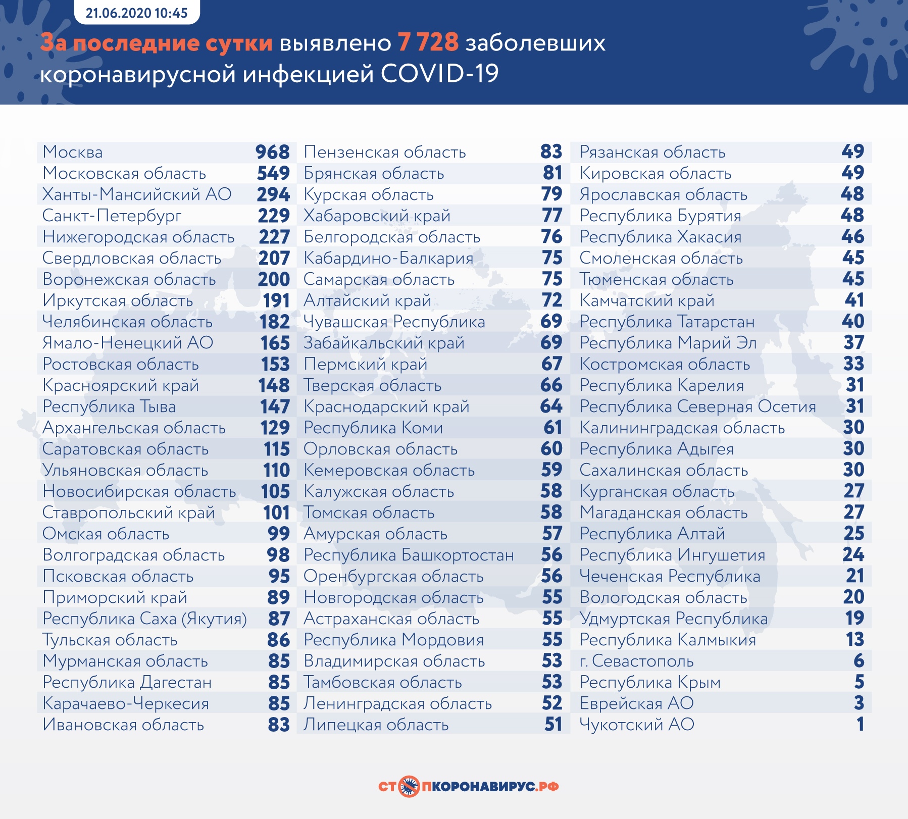 7728 случаев коронавирусной инфекции выявлено за последние сутки в 84 регионах России, в том числе в Оренбургской области – 56.