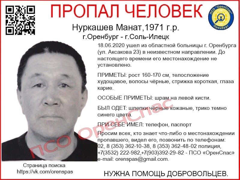 49-летний Манат Нуркашев 18 июня ушёл из Оренбургской областной больницы, и до сих пор его местонахождение неизвестно.