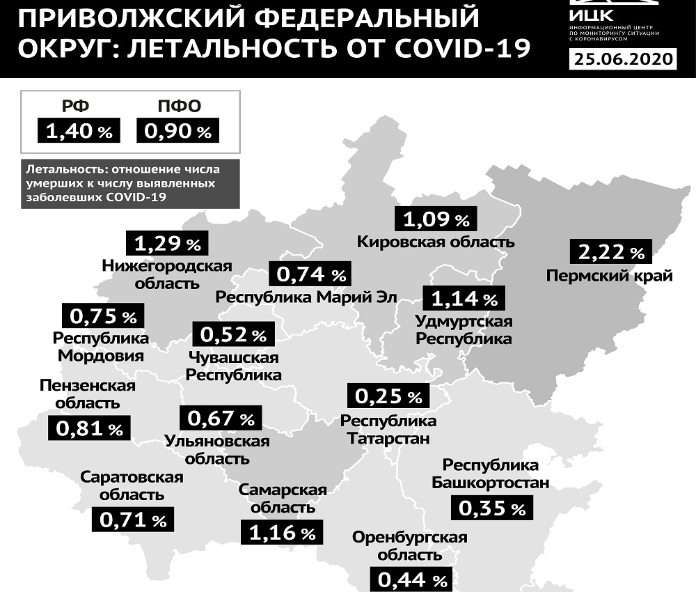 Информационный центр по мониторингу ситуации с коронавирусом подготовил инфографику по уровню летальности от коронавирусной инфекции в регионах Приволжского федерального округа.