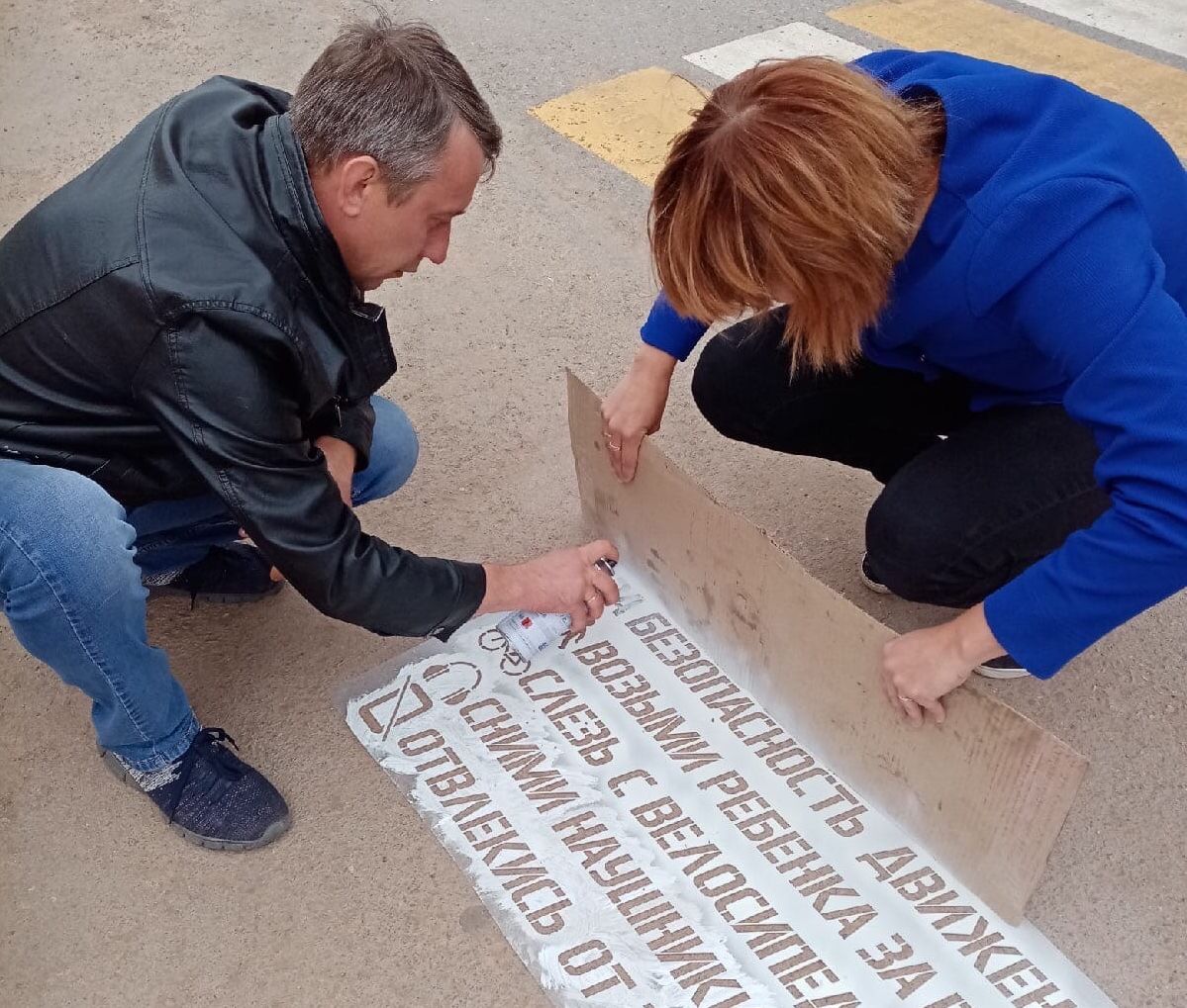 С помощью трафаретов и краски сотрудники Госавтоинспекции и волонтёры наносят на асфальт надписи: «Возьмите ребенка за руку», «Снимите наушники», «Слезь с велосипеда» и «Отвлекись от телефона».