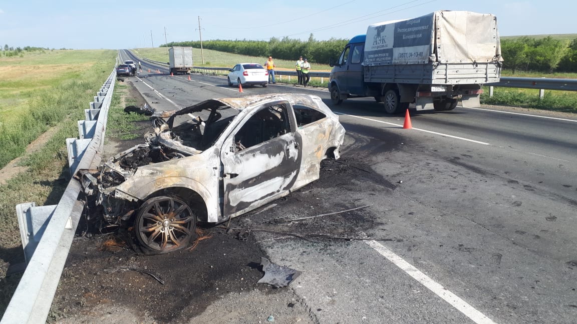 После столкновения один из автомобилей загорелся.