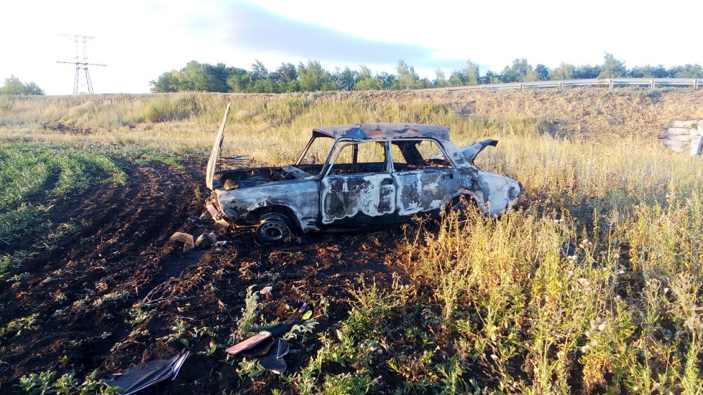 Автомобиль опрокинулся и загорелся.