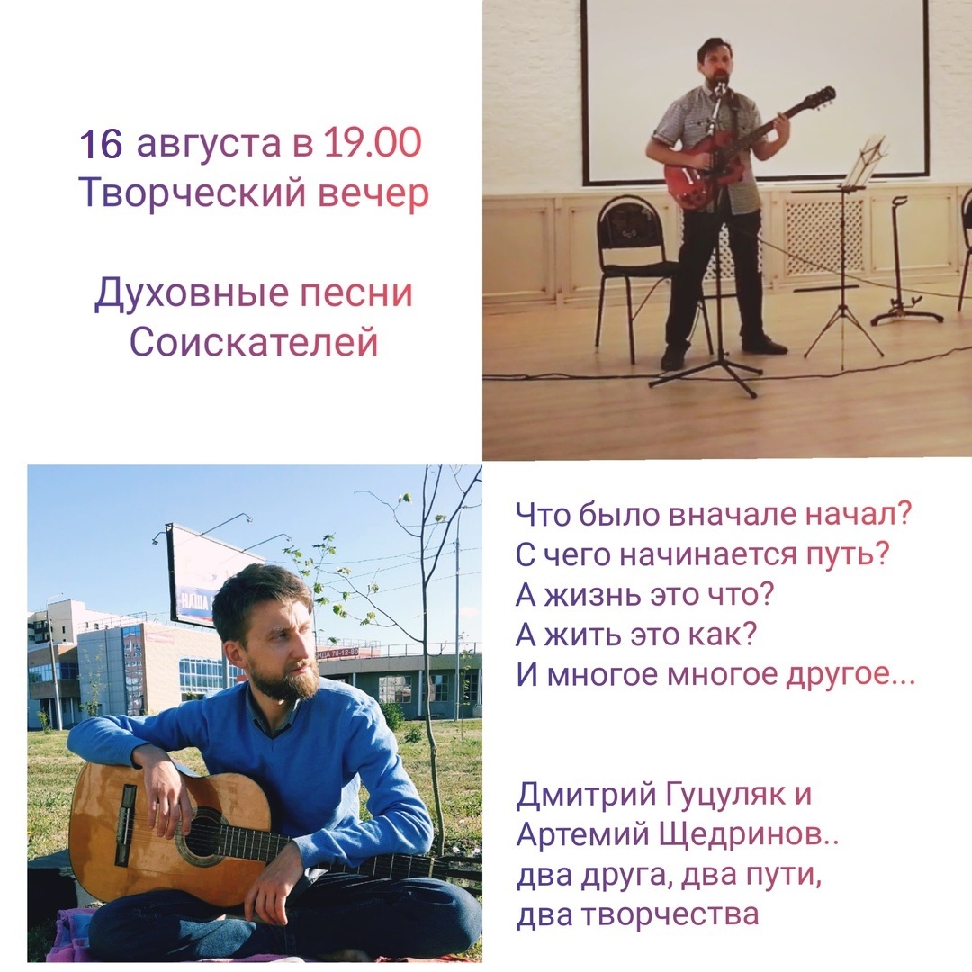 16 августа в 19 часов два автора-исполнителя Дмитрий Гуцуляк и Артемий Щедринов представят гостям вечера-встречи под гитару и флейту свои песни из философского цикла.