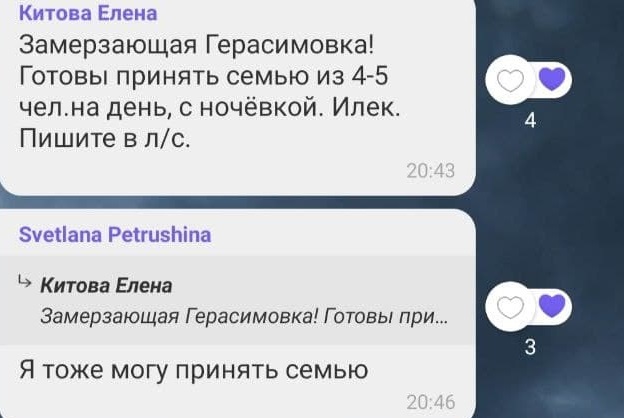 Сразу же в социальных сетях жители Илека и Оренбурга начали оставлять сообщения о готовности приютить семьи из пострадавших поселков. Некоторые были готовы принять у себя до шести человек. Однако большинство людей остались ждать тепла дома, тем более что в региональном МЧС им обещали, что газ подадут в ближайшие часы.
