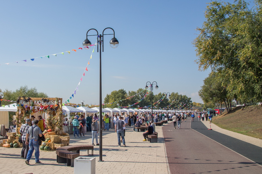 На набережной выстроили самый длинный прилавок в России — 300,7 метров. На нем была представлена продукция оренбургских производителей.