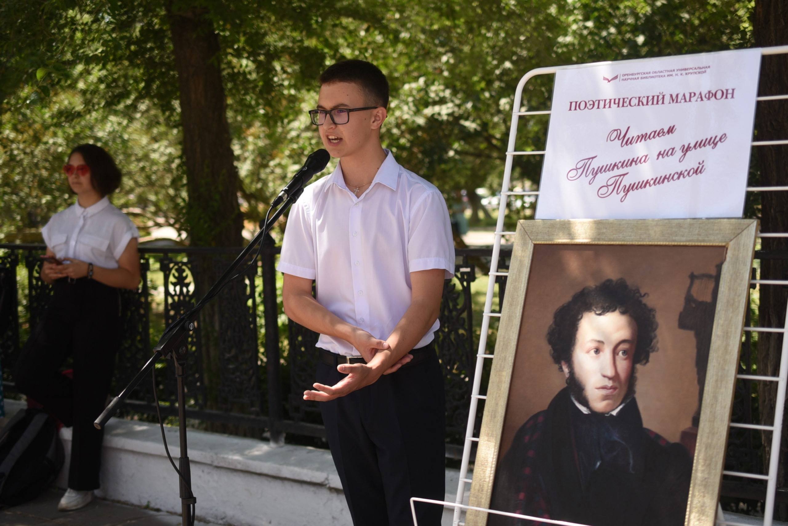 Звучит «Я памятник себе воздвиг нерукотворный». Читает будущий журналист, первокурсница Оренбургского государственного университета Катя Мушкатихина. Затем «Узник», «Бесы», «Я помню чудное мгновенье». Одно стихотворение за другим притягивает к себе народ, желающих вспомнить великого поэта не становится меньше.