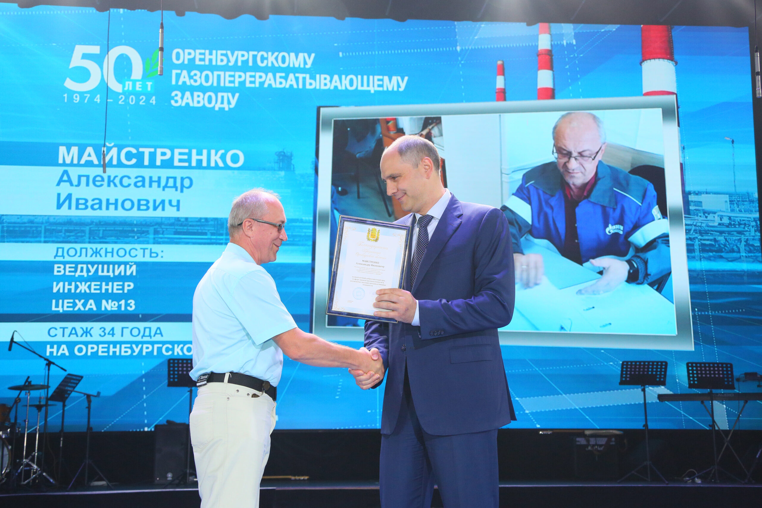 На торжественном вечере состоялась церемония награждения лучших сотрудников предприятия. Губернатор вручил почётную грамоту Оренбургской области за вклад в развитие топливно-энергетического комплекса, высокий профессионализм и трудовые успехи водителю автомобиля транспортного цеха Юрию Королёву. За многолетний добросовестный труд благодарность губернатора области объявлена мастеру цеха № 1 Сергею Лошакову, ведущему инженеру цеха технического надзора Александру Майстренко, заместителю начальника цеха № 2 Евгению Савенко, заместителю начальника производственно-диспетчерской службы Александру Шикову.