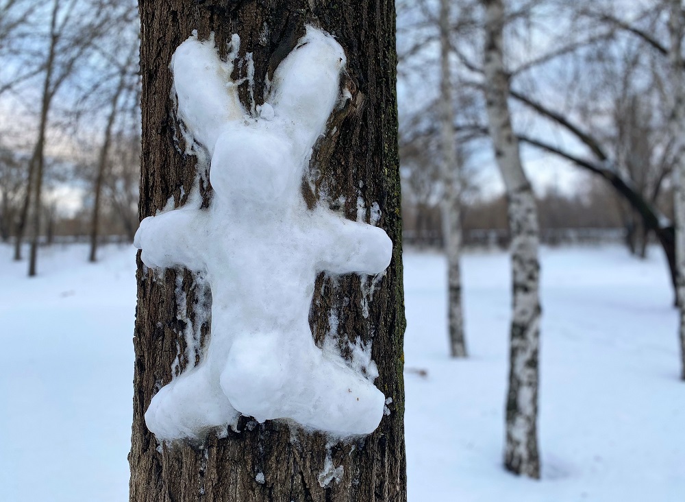 Вон он, на одном из стволов в парке. Половину новогодних каникул лил дождичек, по-весеннему обнажив в парке чистый асфальт. Потом шарахнула метель, с перекрытиями трасс и развёртыванием пунктов обогрева, – всё как мы любим.