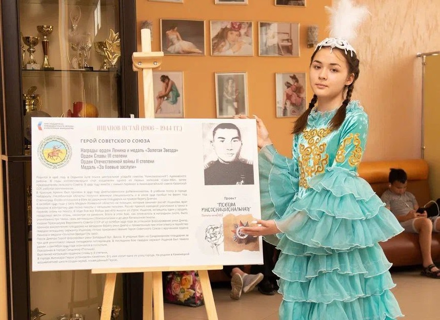 — В 2022 году наша автономия выиграла грант в полмиллиона рублей от Президентского фонда культурных инициатив с проектом «Победа многонациональная», — рассказывает руководитель проектов ОРКНКА Гульнара Аманова. – Он включал три этапа: исследовательские работы школьников об участниках Великой Отечественной войны разных национальностей с последующей выставкой, концерт и создание видеороликов о нескольких героях Советского Союза. Чтобы больше узнать о Мусе Джалиле, мы ездили в Шарлыкский район, об Истае Ищанове – в Адамовку, о генерале Шаймуратове – в Уфу, о Батырхане Нуржанове – в Бердянку.
