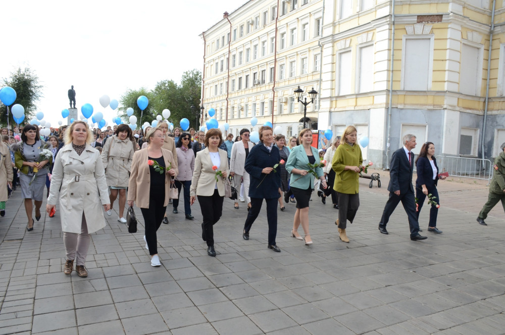 Сегодня по улице Советской — от Пушкинского бульвара до памятника первой учительнице — торжественным шествием пройдут молодые педагоги, руководители образовательных организаций, представители Ассоциации выпускников, учащиеся.