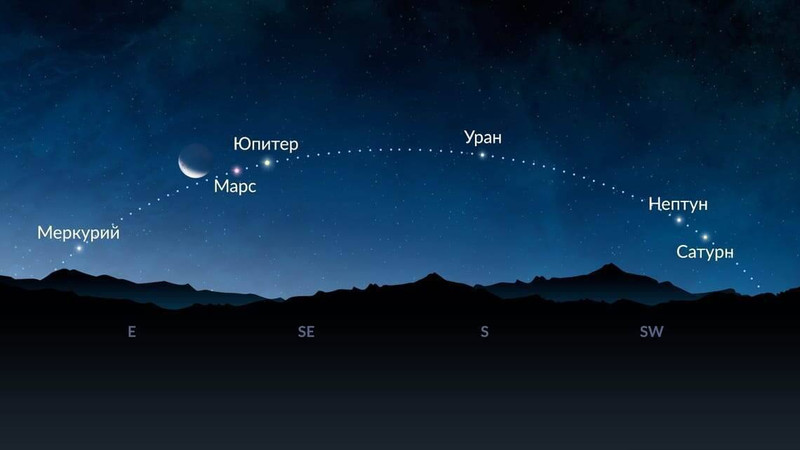 Все планеты, кроме Венеры, расположатся на небосводе Земли по одну сторону от Солнца и будут видны одновременно. В восточной части неба окажутся Меркурий, Марс, Юпитер и Уран, на юго-западе — Нептун и Сатурн.