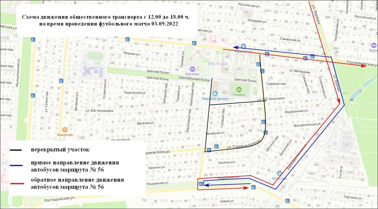На время проведения матча движение автобусов по маршруту №56 будет осуществляться в прямом и обратном направлении по следующим улицам: Ростошинская, Раздольная, Дальнореченская, Воскресенская, Зорянка, Газпромовская.