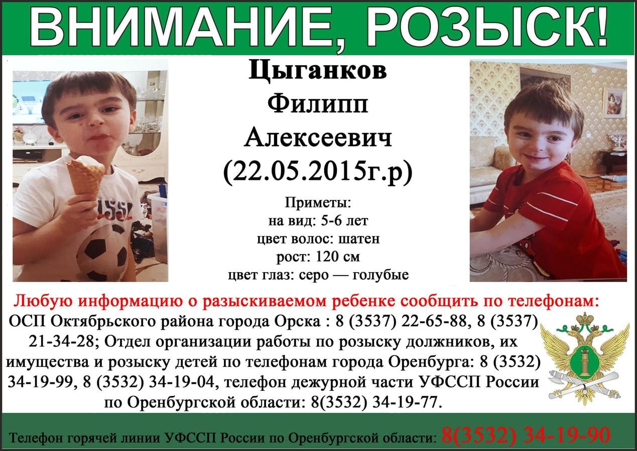 Всех, кто располагает сведениями о местонахождении Филиппа, просим сообщить в ОСП Октябрьского района города Орска по телефонам: 8 (3537) 22-65-88, 8 (3537) 21-34-28, в Отдел организации работы по розыску должников, их имущества и розыску детей по телефонам города Оренбурга: 8 (3532) 34-19-99, 8 (3532) 34-19-04, а также по номеру телефона дежурной части УФССП России по Оренбургской области: 8(3532) 34-19-77. Анонимность гарантируется.