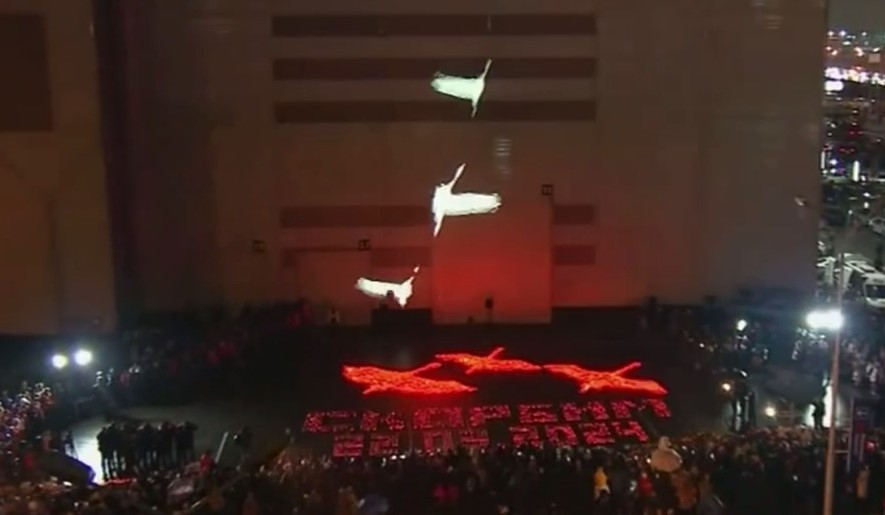 В Москве почтили память тех, кто погиб во время теракта в концертном комплексе 22 марта 2024 года. На стене здания, где находится концертный зал «Крокус Сити Холл», появилась проекция «Летят журавли».