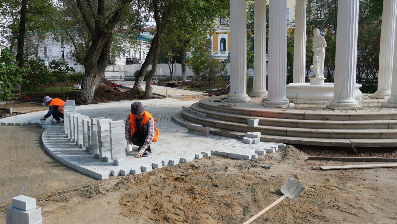 На площадке ежедневно работают до 30 человек и восемь единиц техники ООО «Уни-строй». Территория огорожена. Уже сняли старое покрытие, уложили подстилающие слои, выполнили армированное бетонное основание и начали укладку гранитной плитки.