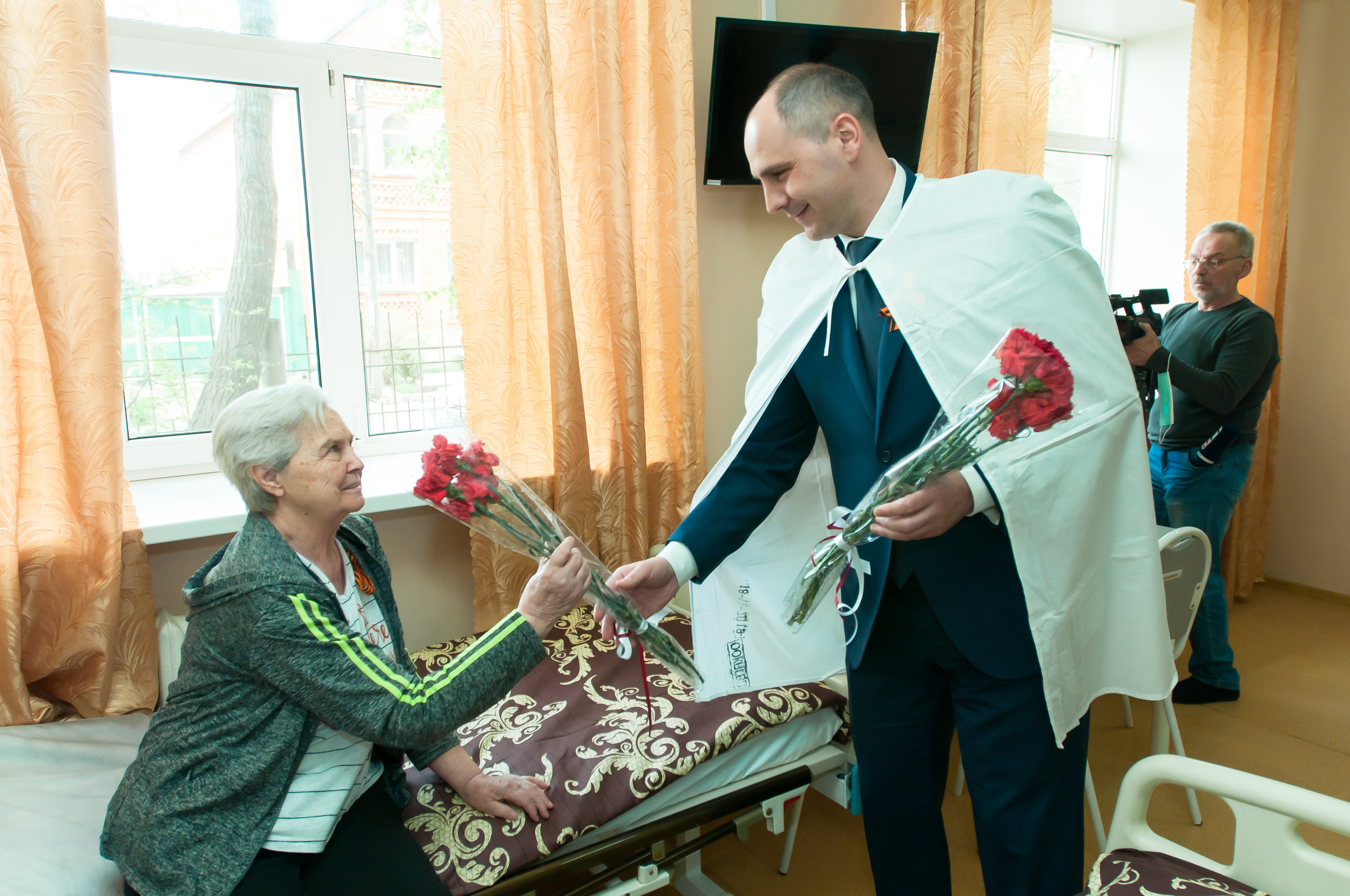 Губернатор поздравил пациентов с Днём Победы и пожелал им скорейшего выздоровления.