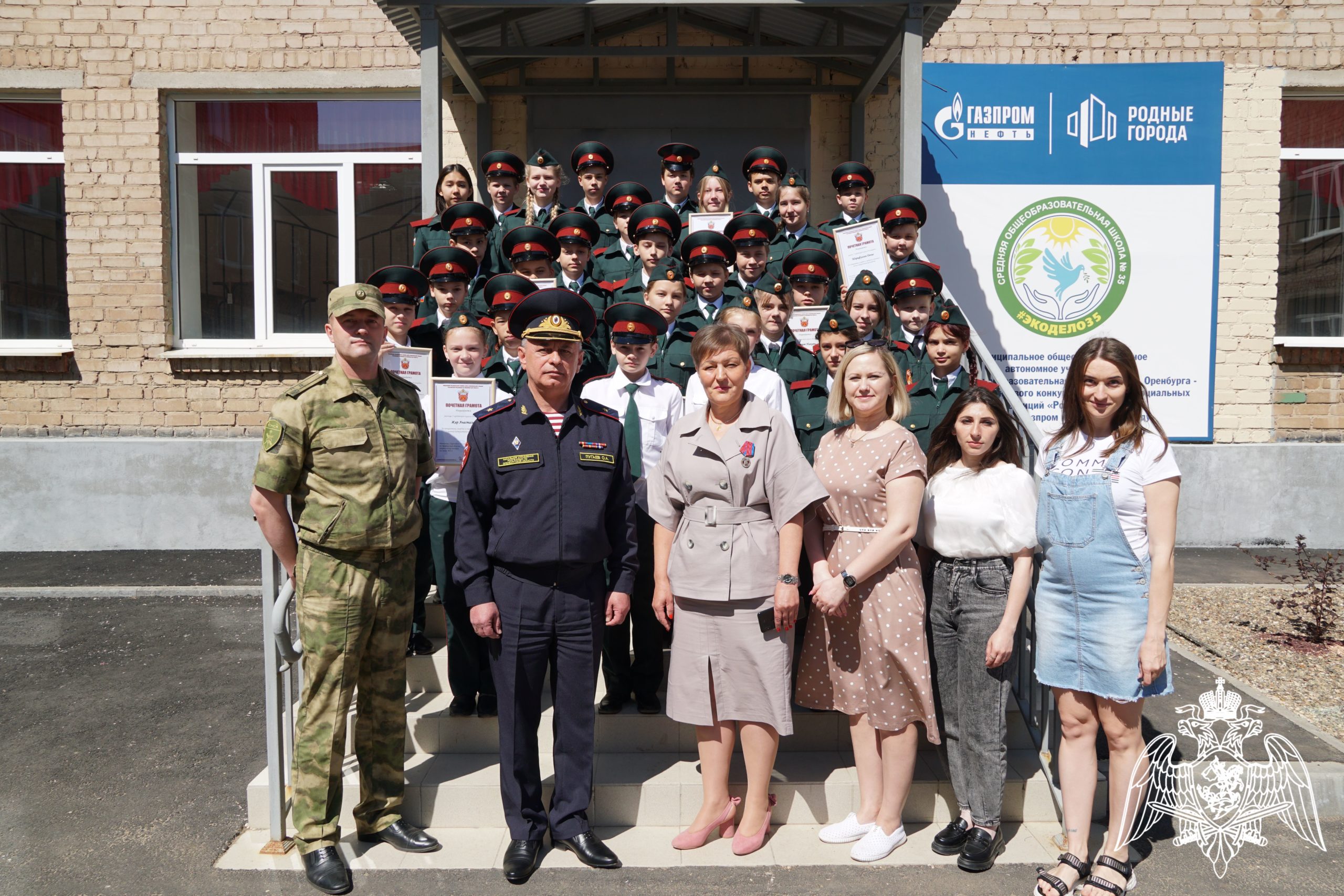 Перед строем начальник Управления Росгвардии по Оренбургской области генерал-майор полиции Олег Пугаев вручил медаль «5 лет Федеральной службе войск национальной гвардии Российской Федерации и 210 лет войскам правопорядка России» директору средней общеобразовательной школы №35 Оренбурга Наталье Долматовой.