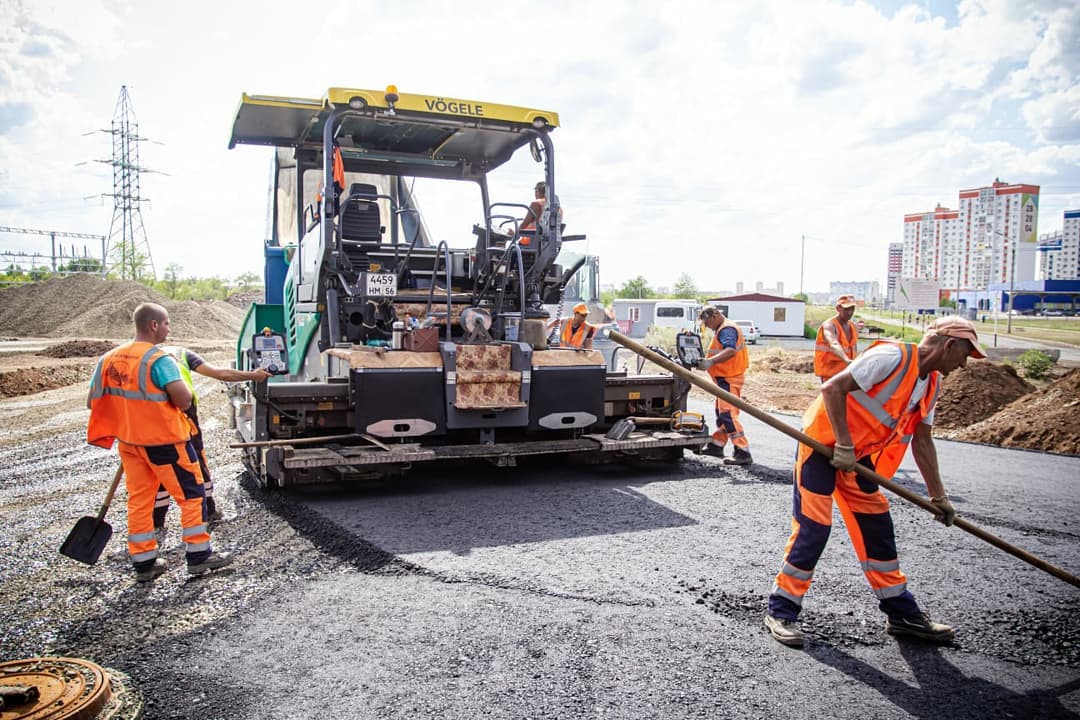 В областном центре продолжается укладка асфальта на кольцевой развязке по улице Рокоссовского в районе проспекта Победы.