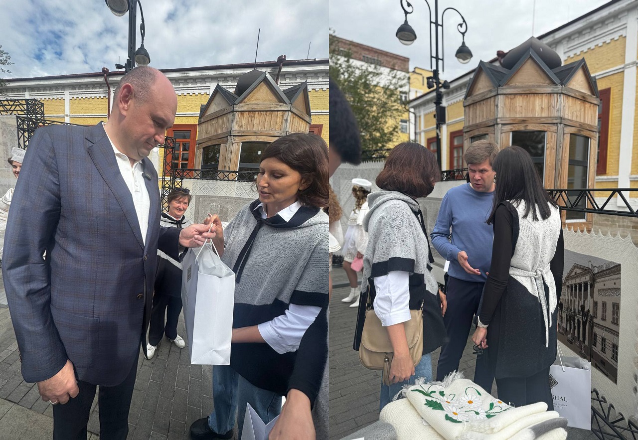 Врио Губернатора Евгений Солнцев с семьёй и врио главы города Альберт Юмадилов посетили стенд Фабрики Оренбургских пуховых платков на Советской в День города.