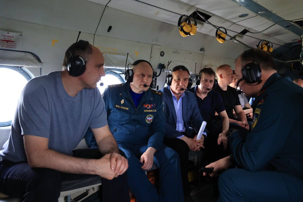 Глава МЧС России Александр Куренков и губернатор Оренбургской области Денис Паслер на вертолёте облетели территории Орска, пострадавшие от весеннего половодья. В первую очередь внимание обратили на пойму Урала.