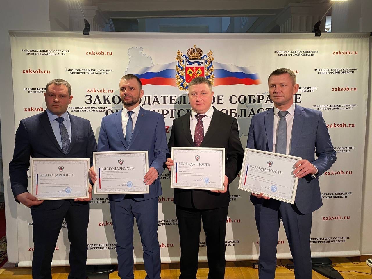 Глава Северного района Михаил Журкин, глава Кваркенского района Сергей Савченко, глава Шарлыкского района Дмитрий Волков и глава Медногорска Андрей Нижегородов получили благодарности Председателя Совета Федерации Валентины Матвиенко.