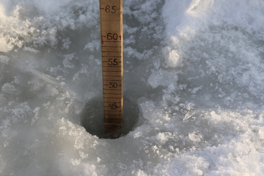 Оптимальное и безопасное значение толщины льда — не менее 7-10 см. Определить толщину льда можно с помощью топорика или бура.