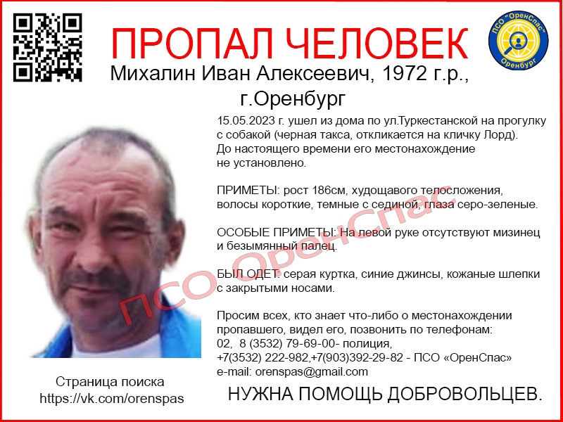 Всех, кто что-либо знает о местонахождении пропавшего или видел его, просят позвонить по телефонам: 02, 8 (3532) 79-69-00- полиция, +7(3532) 222-982,+7(903)392-29-82 — ПСО «ОренСпас» e-mail: orenspas@gmail.com.