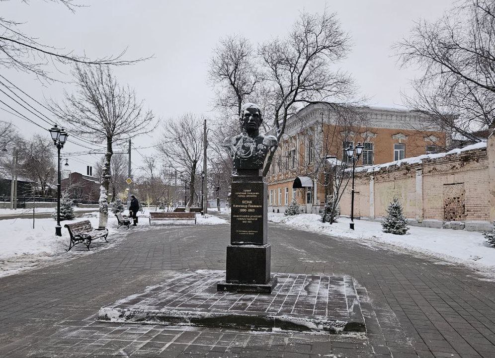 В сквере на пересечении улиц Пушкинской и Бурзянцева установили монумент Александру Безаку. Место было выбрано не случайно – до 1926 года улица Бурзянцева носила имя генерал-губернатора Безака.