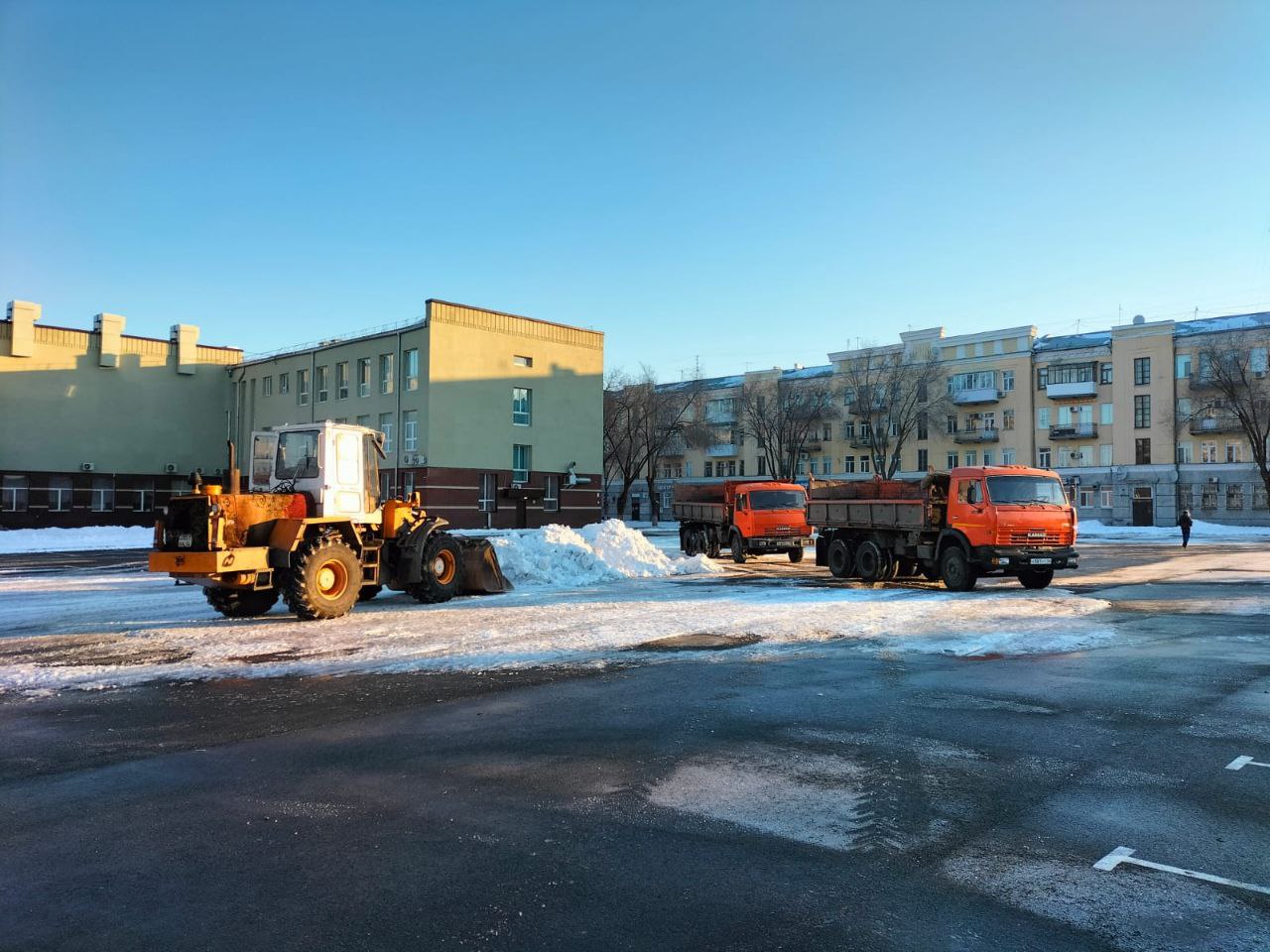 В центре города — на улице Советской и площади Ленина — техника сгребала снег в кучи. В ближайшее время он отправится на снежные полигоны.