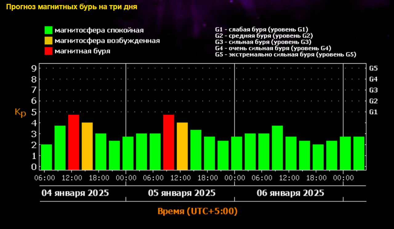 В воскресенье, 5 января, ожидается аналогичная магнитная буря. Она начнется после 8 часов утра. Геомагнитная активность резко поднимется до пяти баллов по Кр-индексу.