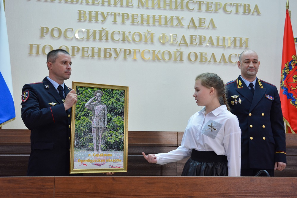 В знак благодарности и уважения Виктория подарила министру картинку из алмазной мозаики, собранную своими руками. На картине изображен памятник сотрудникам органов внутренних дел, который стоит в районном отделе полиции.