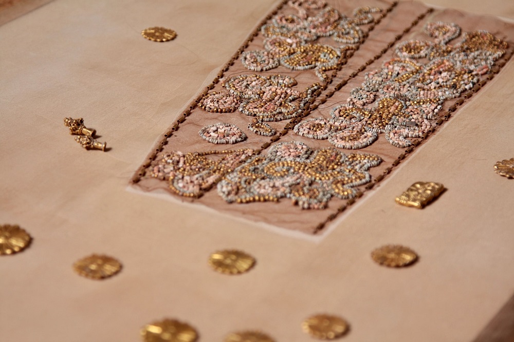 За два года работы в мастерской археологического текстиля и кожи реставрационного центра имени Грабаря был воссоздан первоначальный орнамент, украшавший одежды. Это вышивка из золотого бисера и стекляруса, а также ракушек каури, кораллов и лазуритов и около 400 цветов-розетт из штампованного золота.