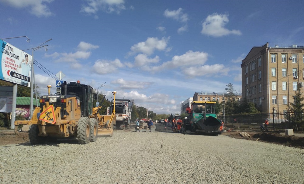 На участке от улицы Маршала Жукова до улицы Степана Разина улицы Аксакова выполнена укладка дорожной одежды в нижних слоях, завершаются установка бортового камня и выставление люков по уровню проезжей части.